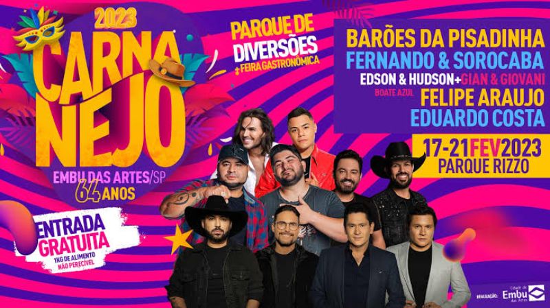 Para celebrar os 64 anos de Embu das Artes, a Prefeitura traz o 1º Carnanejo da cidade de 17 a 21/2, com muita festa, música e diversão para toda a família. Serão cinco dias de folia no Parque Francisco Rizzo. Além dos shows com artistas regionais e grandes nomes da música brasileira, o público contará com feira gastronômica, parque de diversões e muito mais. A entrada será 1 kg de alimento não perecível.